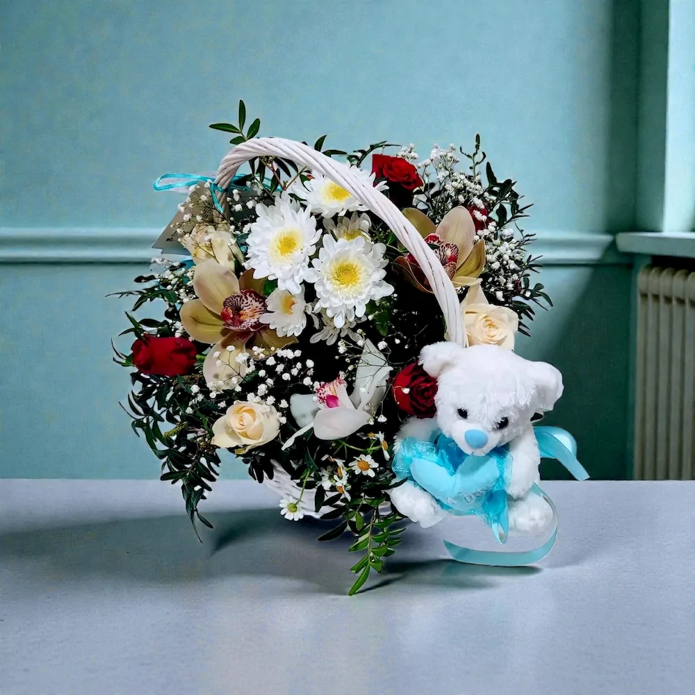 Η σύνθεση Little Prince δημιουργήθηκε για να γιορτάσει τον ερχομό μιας νέας ζωής. Το χειροποίητο πλεκτό καλάθι προσδίδει μια αίσθηση ζεστασιάς, ενώ η επιλογή των ανθέων ακολουθεί τα υψηλότερα πρότυπα της Luxury Boutique αισθητικής μας στο Μαρούσι.