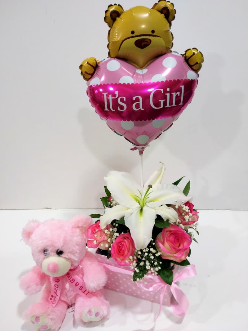Το ανθοπωλείο μας σας προτείνει μία υπέροχη, εντυπωσιακή ανθοσύνθεση για κορίτσι σε χάρτινο τετράγωνο ροζ πουα κουτί με τριαντάφυλλα, λίλιουμ, λούτρινο ζωάκι και μπαλόνι foil.