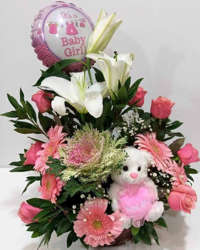 Το ανθοπωλείο μας σας προτείνει μία υπέροχη, εντυπωσιακή ανθοσύνθεση για κορίτσι σε πλεκτό καλάθι με τριαντάφυλλα, ζέρμπερες, λίλιουμ, λούτρινο ζωάκι και μπαλόνι foil.