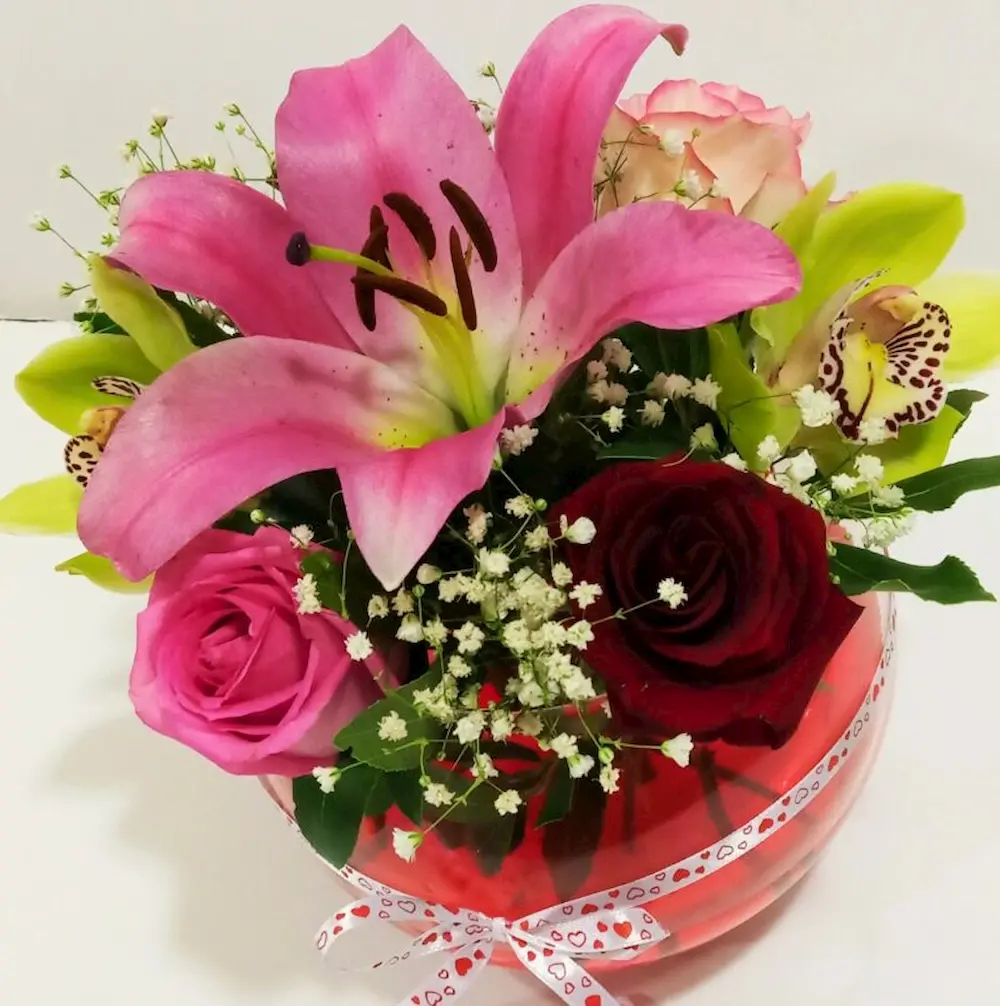 Το ανθοπωλείο μας σας προτείνει μια υπέροχη ανθοσύνθεση σε στρογγυλή γύλα με κόκκινο τζελ με ολόφρεσκες ορχιδέες σιμπντίουμ, τριαντάφυλλα και λίλιουμ οριεντάλ.