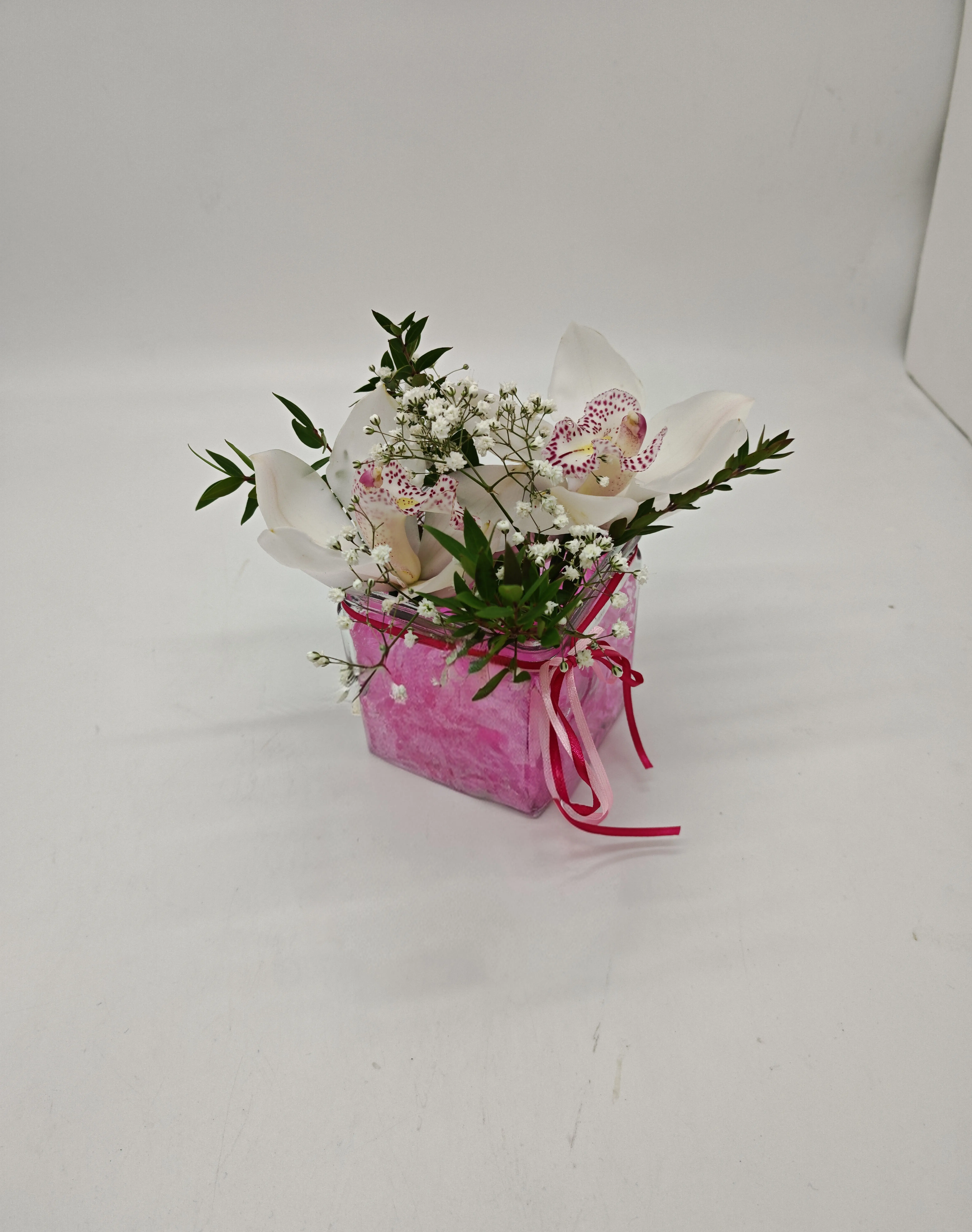 Ανθοσύνθεση με ροζ τζελ σε γύαλινο κύβο με ορχιδέες συμπίντιουμ (Cymbidium)
