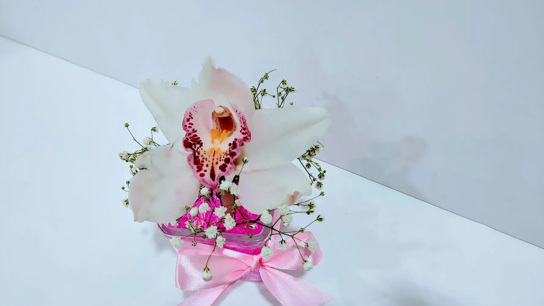 Ανθοσύνθεση ορχιδέας σε γυάλινο κύβο με ροζ τζελ