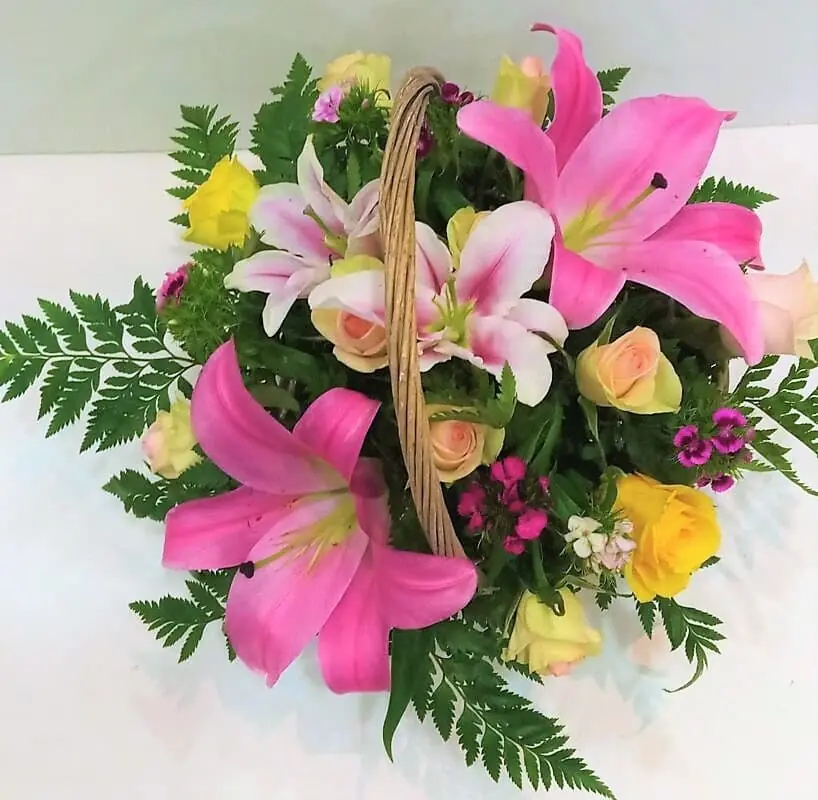 Ανθοσύνθεση σε καλάθι με λίλιουμ και τριαντάφυλλα