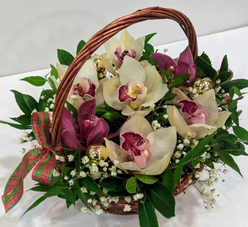 Ανθοσύνθεση σε καλάθι με ορχιδέες σιμπίντιουμ