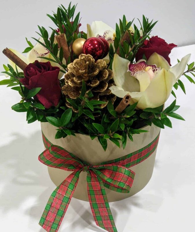 Ανθοσύνθεση σε στρογγυλό κουτί με τριαντάφυλλα και ορχιδέες σιμπίντιουμ.