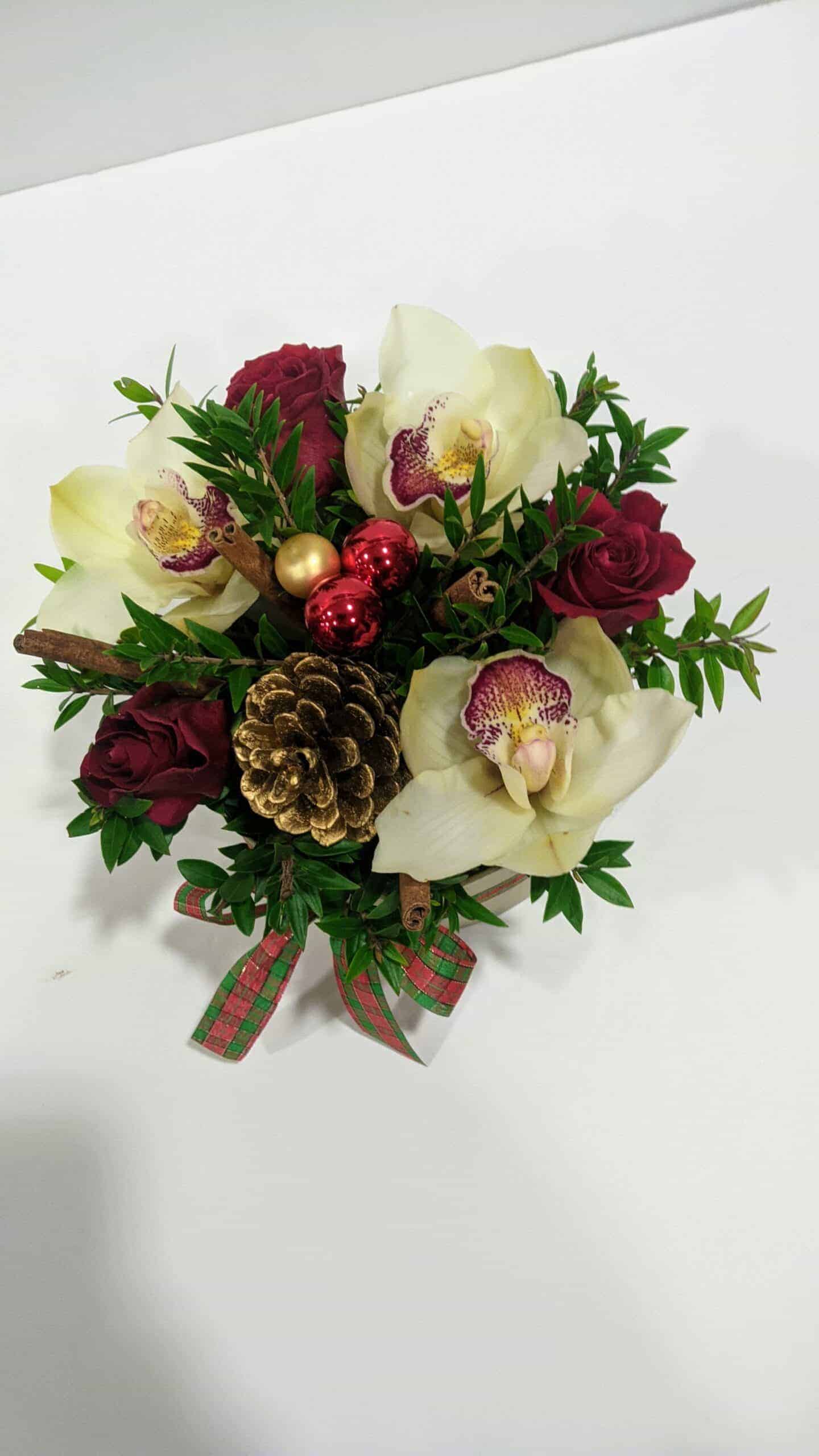Ανθοσύνθεση σε στρογγυλό κουτί με: τριαντάφυλλα ορχιδέες σιμπίντιουμ