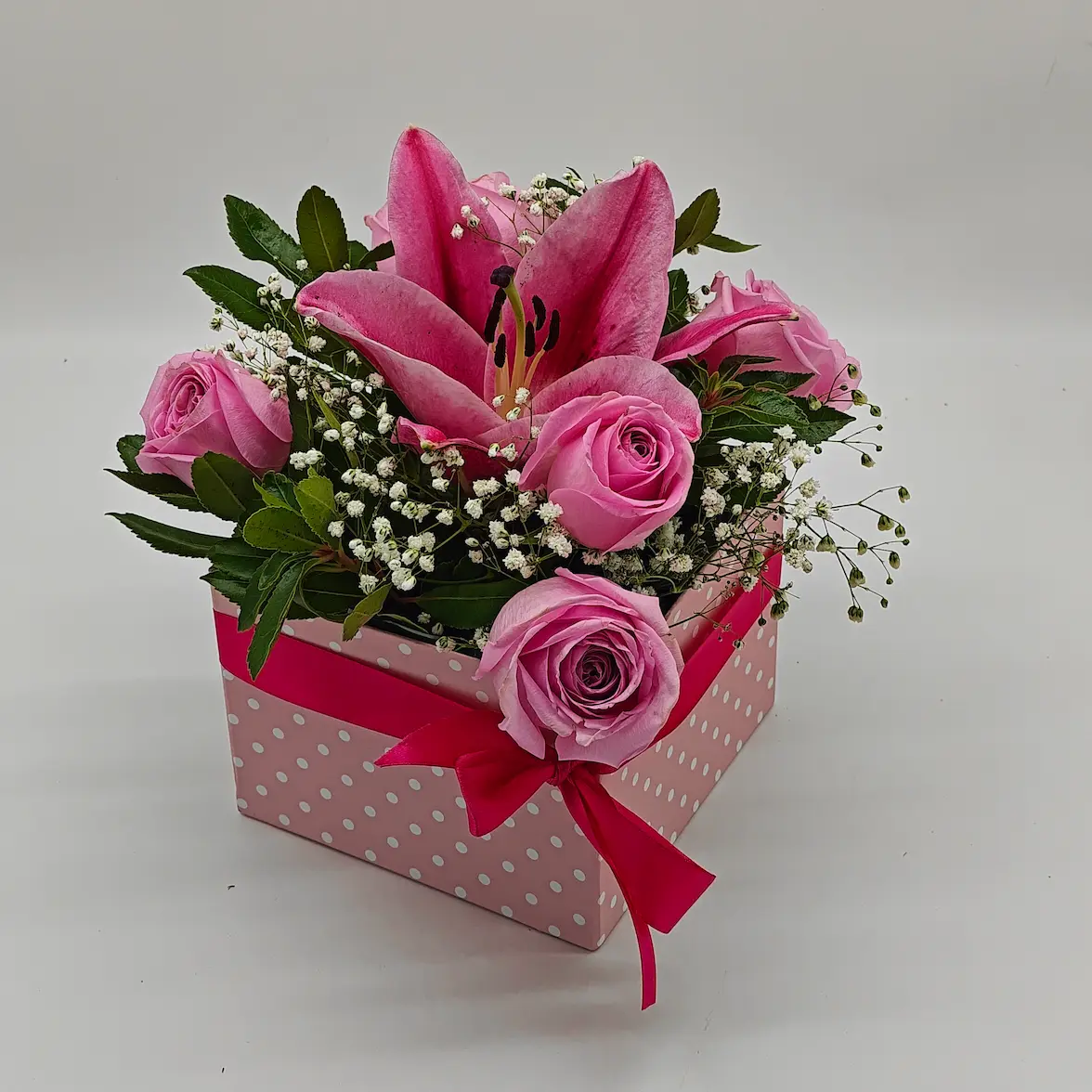 Ανθοσύνθεση σε τετράγωνο ροζ πουά κουτί