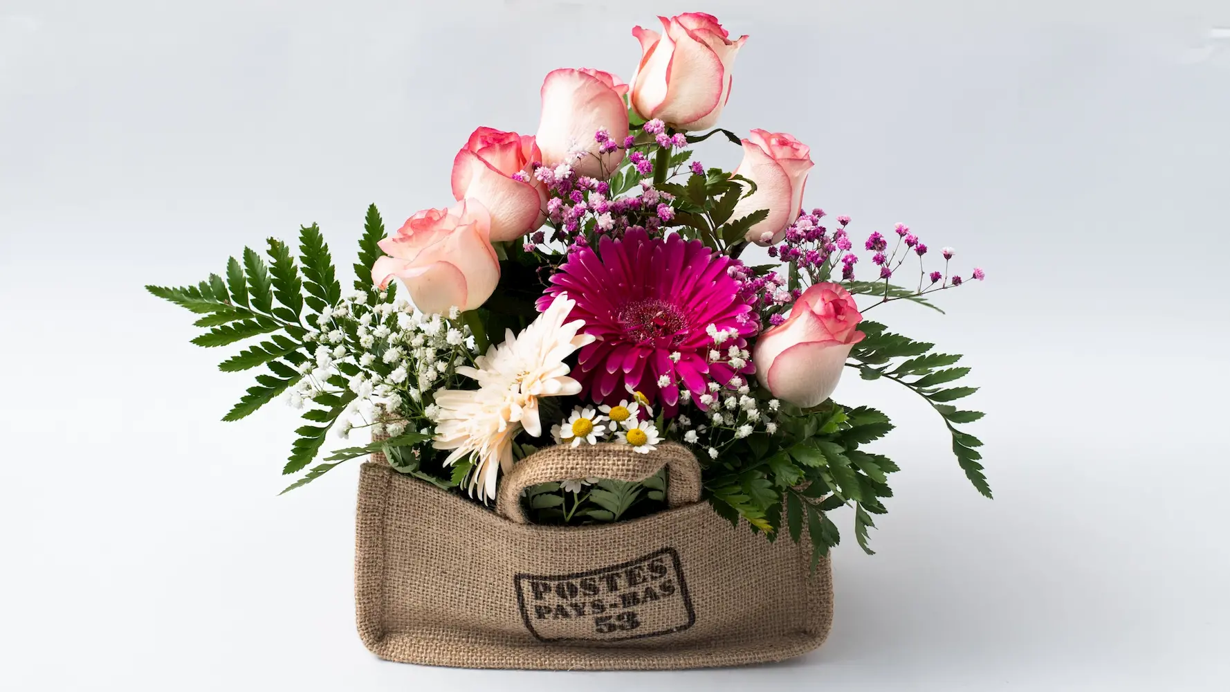 Μια υπέροχη ξεχωριστή ανθοσύνθεση με ροζ τριαντάφυλλα, ζέρμπερες, χαμομήλι και φτέρες σε τσαντάκι από λινάτσα.