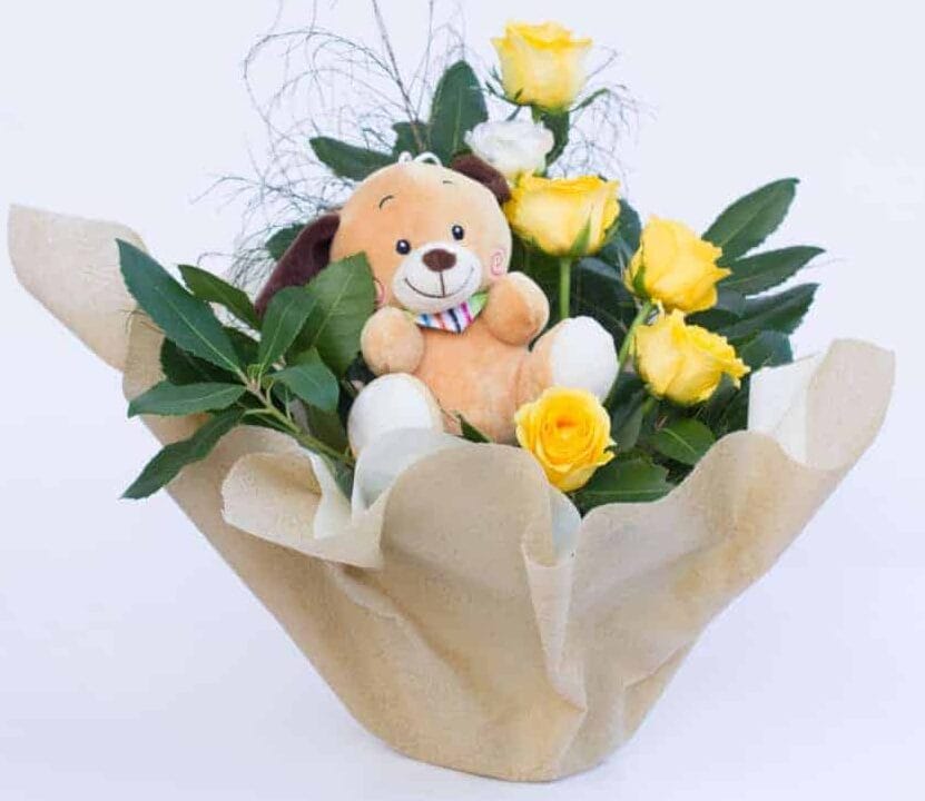 Μια ξεχωριστή υπέροχη ανθοσύνθεση με κίτρινα, λευκά τριαντάφυλλα και λούτρινο ζωάκι.