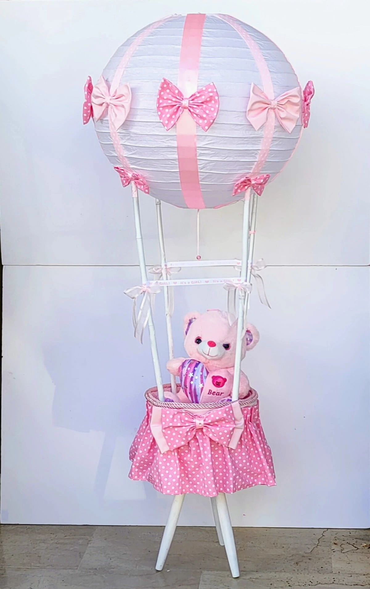 Ένα τεράστιο εντυπωσιακό επιδαπέδιο φωτιστικό αερόστατο ύψους 130cm και διάμετρο άνω των 100cm με λούτρινο ζωάκι σε ξύλινη βάση για να φωτίσει και να διακοσμήσει το δωμάτιο του μωρού σας.