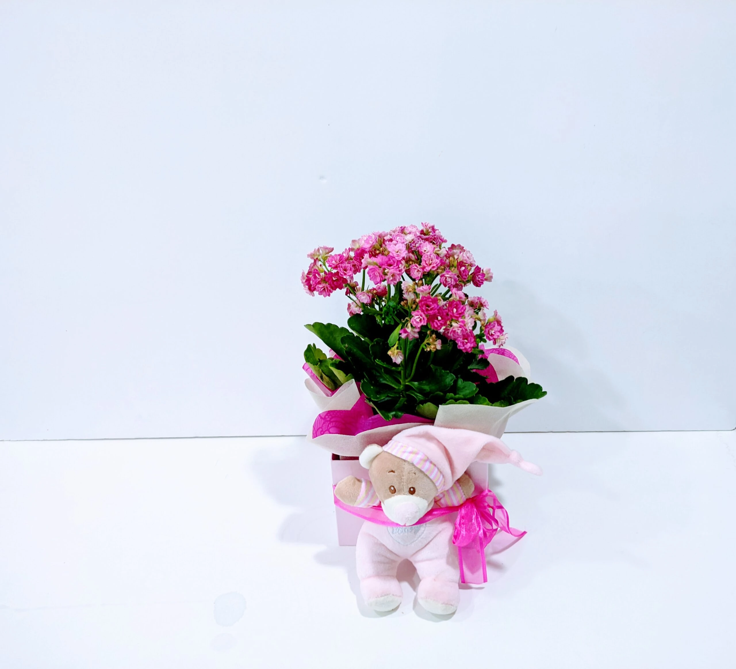 Καλαγχόη κόκκινη σε τετράγωνο κουτί με λούρτινο. Ένα όμορφο και πρακτικό δώρο για το νεογέννητο κοριτσάκι. Με την επιλογή αυτού του δώρου θα κάνετε σίγουρα χαρούμενους τους νέους γονείς γιατί είναι ένα εύκολο στην συντήρηση του φυτό που θα διακοσμήσει τον χώρο του σπιτιού, το κουτάκι σαν πρακτικότητα θα χωρέσει διάφορα αντικείμενα του μικρού και τέλος το λούτρινο ζωάκι για αγαπησιάρικες αγκαλιές