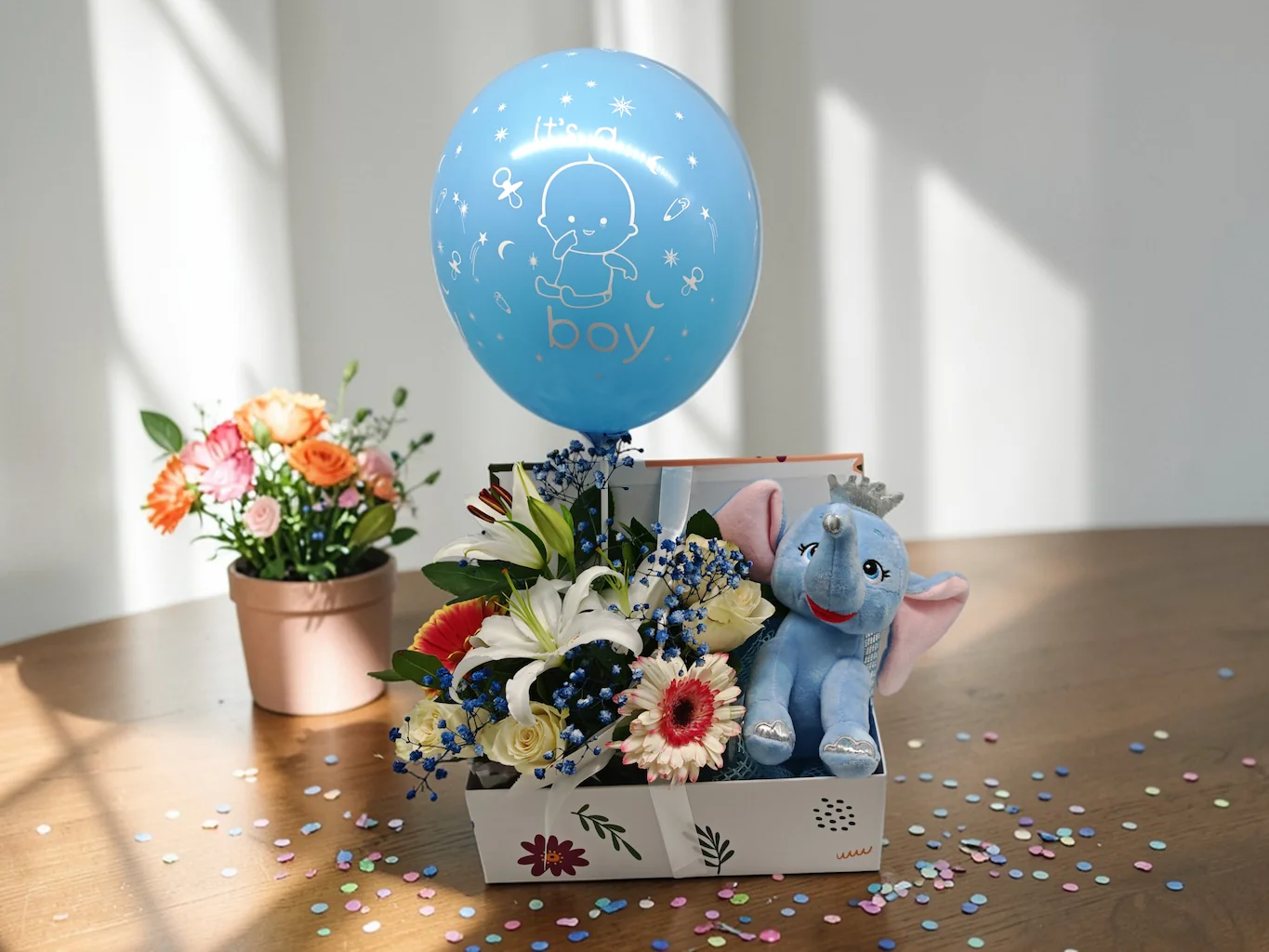 Καλωσορίστε τον νέο πρίγκιπα με μια σύνθεση που αποπνέει τρυφερότητα και πολυτέλεια. Το δώρο γέννησης για αγόρι που συνδυάζει την υψηλή ανθοδετική του Dragatakis Flowers με τη γλυκύτητα ενός premium λούτρινου.