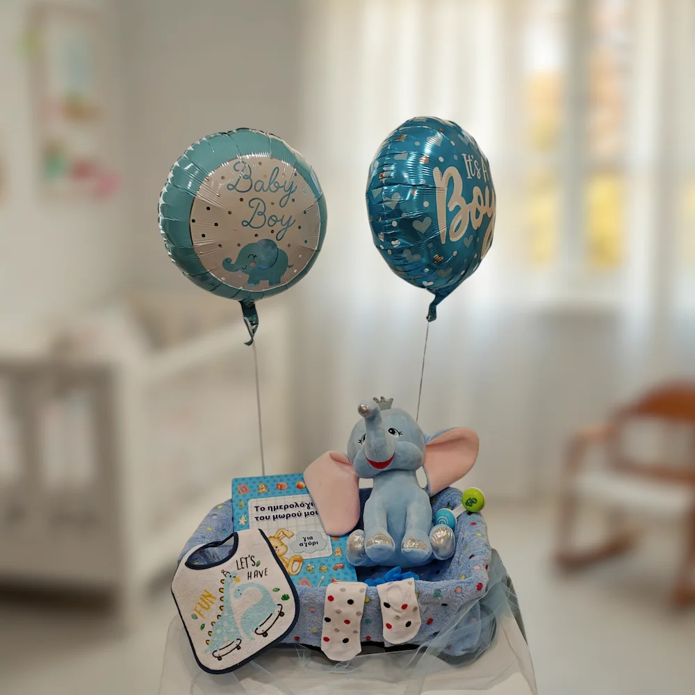 Κάθε σύνθεση περιλαμβάνει λούτρινο ελεφαντάκι 35cm, fleece κουβερτάκι και είδη πρώτης ανάγκης, εξασφαλίζοντας ότι τα δώρα για νεογέννητο αγόρι που επιλέγετε είναι ταυτόχρονα όμορφα και χρήσιμα.
