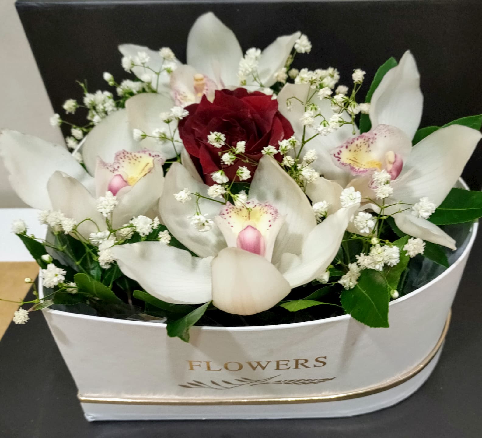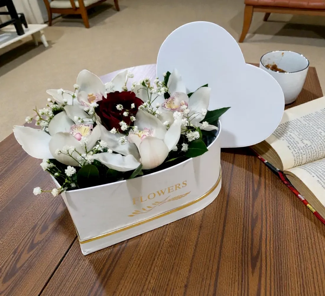 Η Ανθοσύνθεση καρδιά με ορχιδέες φιλοξενείται σε πολυτελές λευκό κουτί καρδιά. Τα άνθη είναι τοποθετημένα σε ειδικό σφουγγάρι βρεγμένο με νερό, εξασφαλίζοντας ότι θα παραμείνουν ζωντανά και αναλλοίωτα για μεγάλο χρονικό διάστημα.