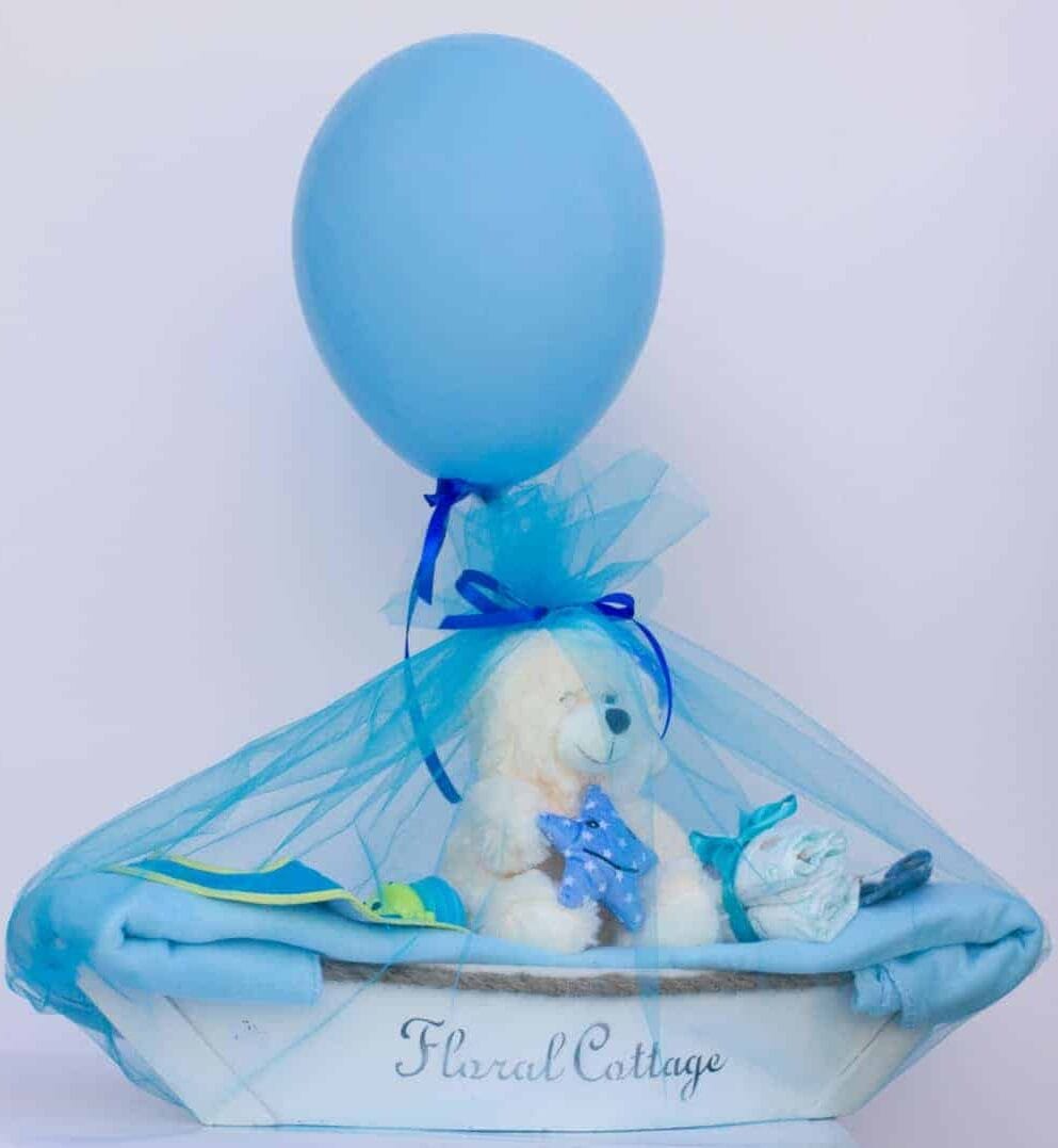 Σύνθεση για αγοράκι σε ξύλινο καραβάκι με κουβερτάκι, σαλιάρα, πάνες μωρού, καλτσάκια, λούτρινο αρκουδάκι και μπαλονάκι.